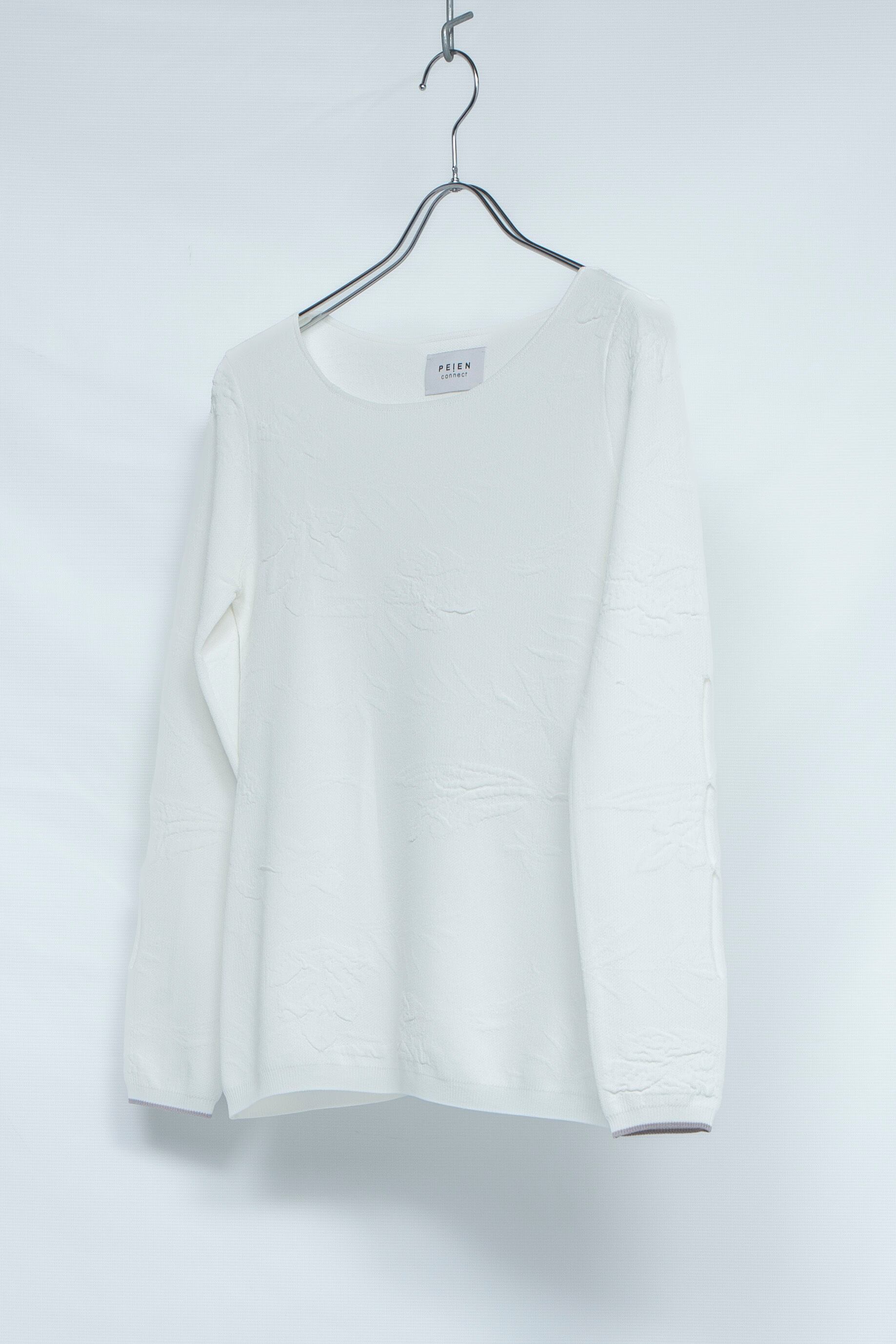サイズ:F SIZE 着丈:59cm 身幅:40cm 肩幅:36cm 裾幅:45cm 着用モデル 174cm 袖のスリットが上品な印象のニットトップス。立体的なボタニカル柄をニットで表現しており、控えめながらもしっかりと他とは違う上質感のある仕上がりに。 袖の配色変えをジャケットから覗かせたり、やや広めのネックラインなのでネックレスとのスタイリングもおすすめです。 素材:Viscose 63% nylon 37% カラーBeige/White/Black