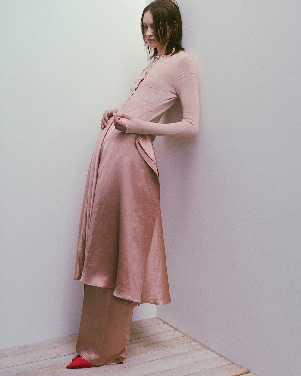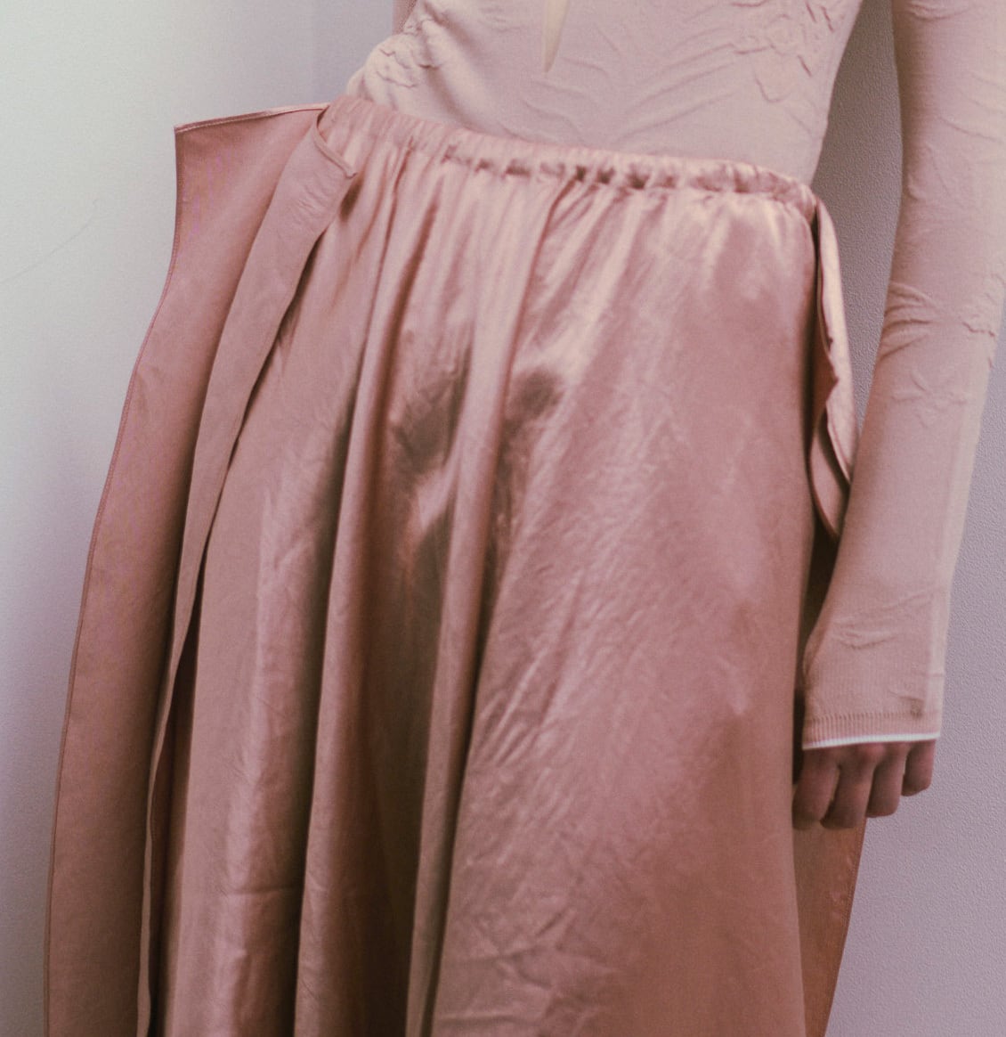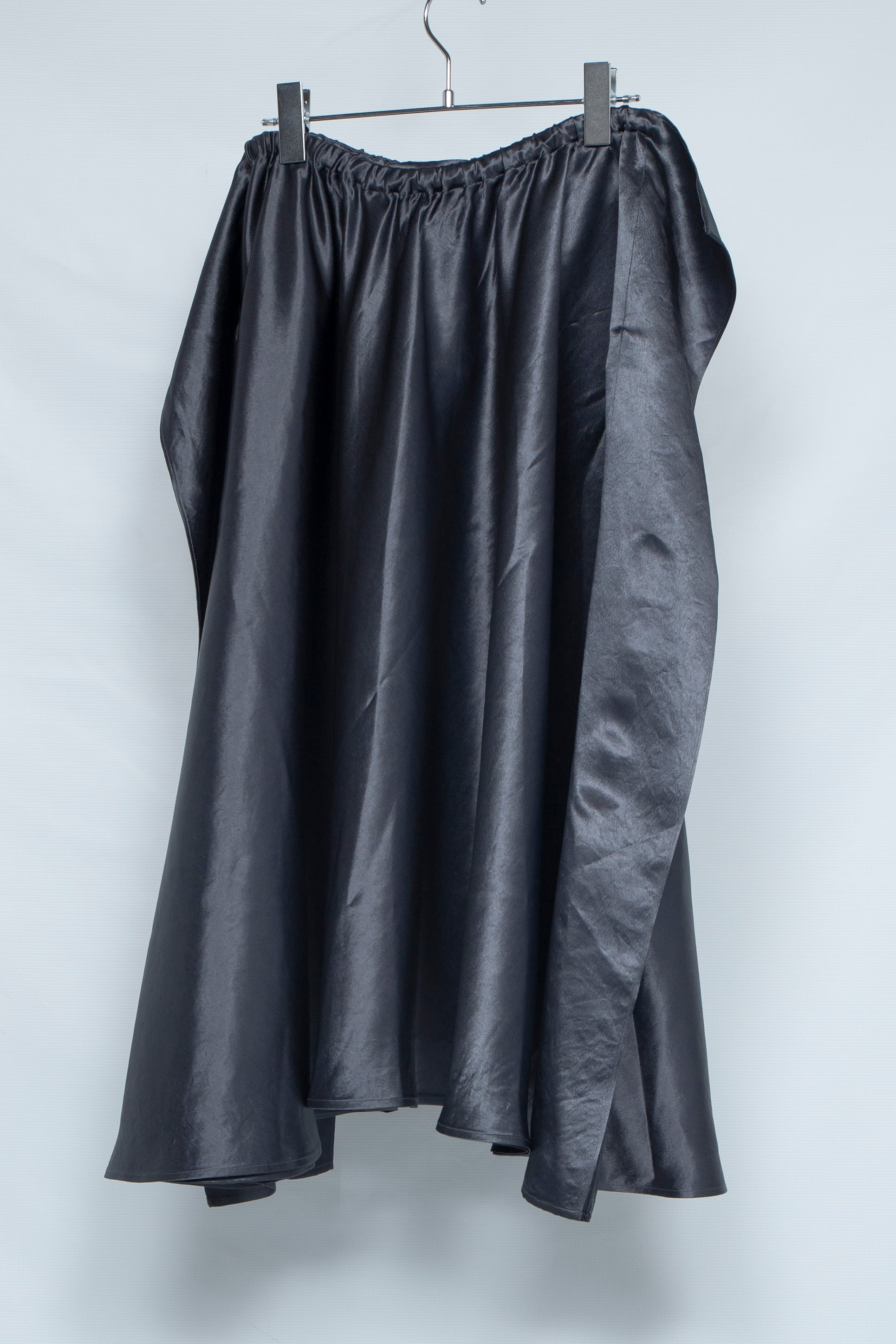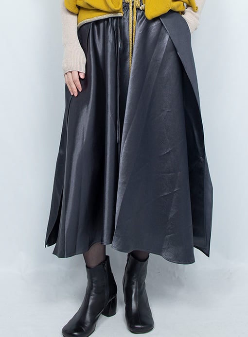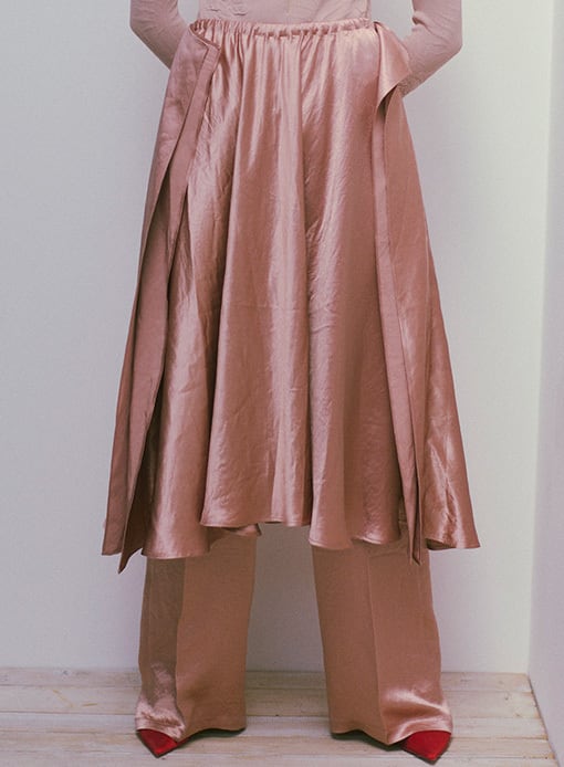 サイズ:F SIZE 着丈:75cm ウエスト:31~48cm 着用モデル 174cm 前後着用可能。ミニマルなデザインのフレアスカート。サテン生地光沢のある生地感とシンメトリーなドレープが品のある雰囲気に。高級感のあるアセテート100%を使用。 素材:Acetate 100% カラーPink Beige/Dark Navy