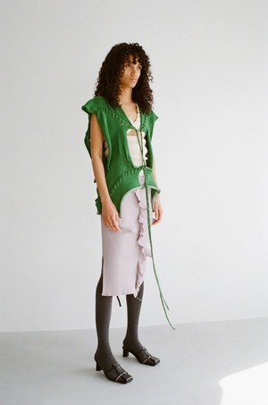 オールニットで仕上げた ドレッシーな スカート。 立体感角編みはアクセントです。 レーヨン 65% ナイロン 35% F 着丈68 ウエスト34 裾37